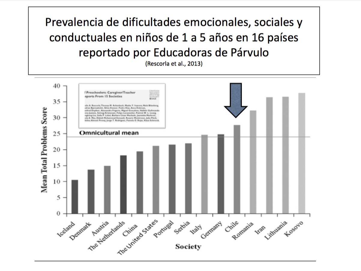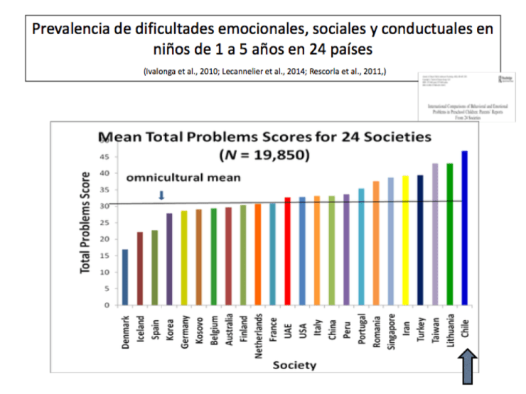 Por ejemplo, el siguiente gráfico muestra que Chile es el país con mayor prevalencia de dificultades emocionales, sociales y conductuales en niños de 1 a 5 años en 24 países investigados. Este es el estudio más grande que se ha publicado en el mundo con una muestra de aproximadamente 20.000 niños y los resultados de Chile son aterradores sobre todo considerando que somos en Latinoamérica el país Nº 1 en políticas públicas de infancia y en investigación sobre la infancia. Los informantes de esta investigación fueron los padres.