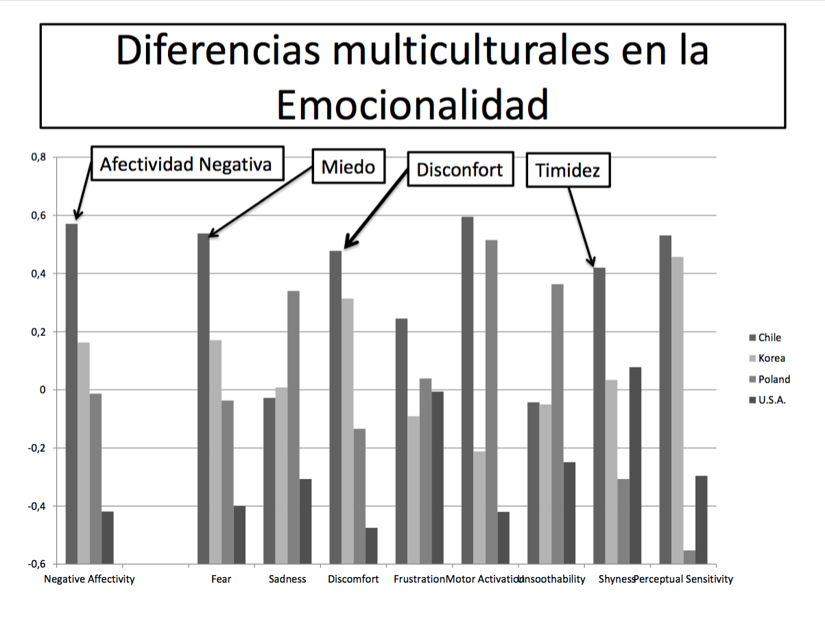 En otra investigación, los niños chilenos de 16 a 36 meses tienen los niveles más altos de miedo, afectividad negativa, de disconfort y timidez, comparado con Korea, Polonia y USA.